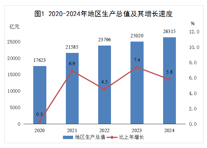 初步核算,全年地区生产总值[2]26314.6亿元,比上年增长5.8%。其中,第一产业增加值2872.6亿元,比上年增长5.6%;第二产业增加值11604.4亿元,增长7.0%;第三产业增加值11837.6亿元,增长4.9%。三次产业比例为10.9:44.1:45.0,第一、二、三产业对地区生产总值增长的贡献率分别为10.7%、47.4%和41.9%。全年人均地区生产总值110011元,比上年增长6.1%。
