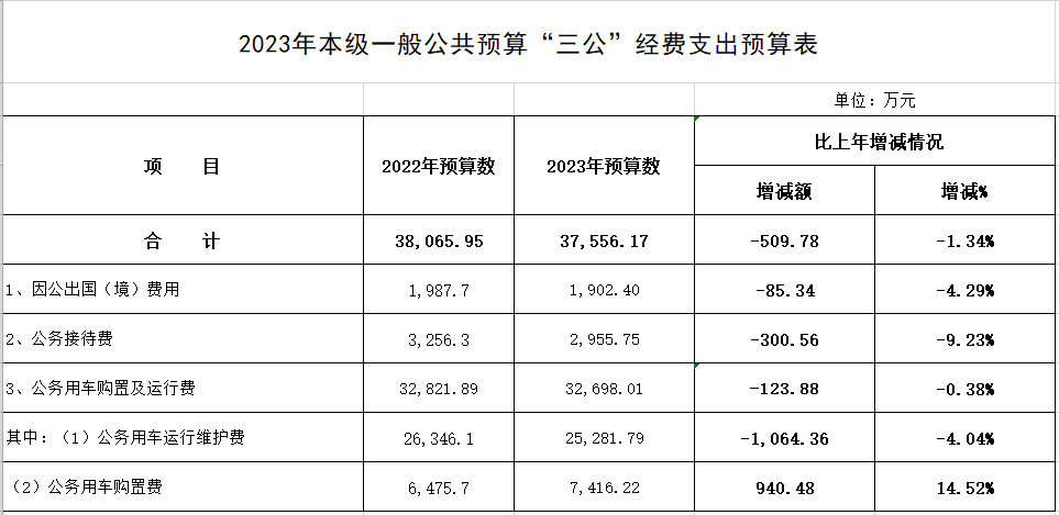 根据《ld体育中国官方网站办公厅关于改革完善内蒙古自治区本级财政科研经费管理的实施意见》(内政办发【2022】37号),科研经费中列支的国际合作和交流费用不纳入“三公”经费统计范围。剔除科研经费中“因公出国(境)费”210.67万元后,2023年,自治区本级一般公共预算安排本级行政单位、事业单位(含参照公务员法管理的事业单位)和其他单位“三公”经费预算数3.76亿元,比上年减少509.78万元,下降1.3%,继续保持只减不增。其中,因公出国(境)费1902.4万元,下降4.3%;公务接待费0.3亿元,下降9.2%;公务用车购置及运行费3.3亿元,下降0.4%,其中,公务用车购置费7416.2万元,增长14.5%,主要用于本级机关事业单位公务用车正常配置更新,公务用车运行费2.5亿元,下降4%。
