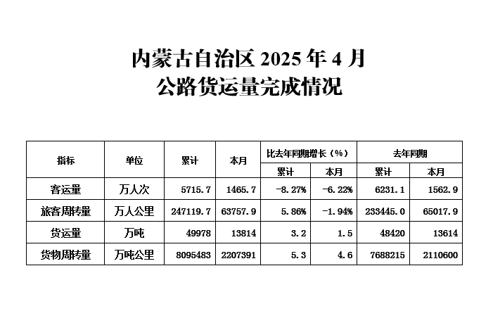 内蒙古自治区2025年1-4月公路运输量完成情况
