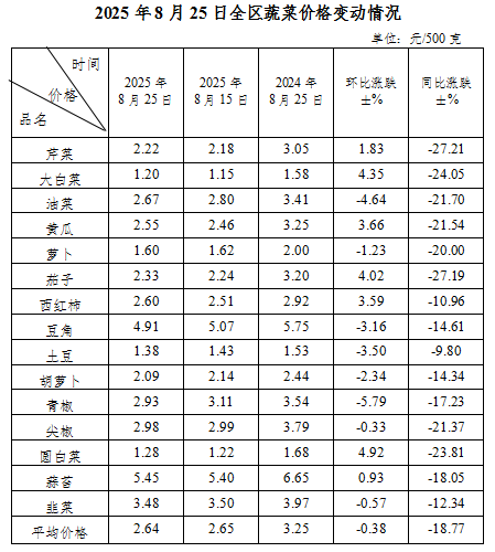 8月25日,全区蔬菜综合平均零售价格为2.64元/500克,环比略降0.38%。本旬监测的15种蔬菜品种价格7涨8降,下降幅度占前五位的品种为青椒、油菜、土豆、豆角、胡萝卜,分别下降5.79%、4.64%、3.50%、3.16%、2.34%。与去年同期相比,15个蔬菜品种综合平均零售价格下降18.77%。
