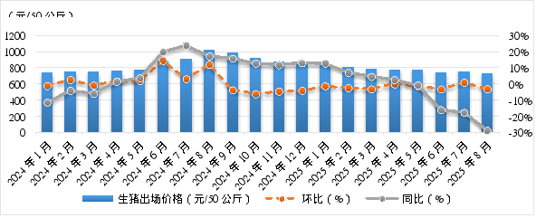 8月份,全区生猪平均出场价格为725.00元/50公斤,与7月份相比(以下简称环比)下降3.27%,与2024年8月份相比(以下简称同比)下降29.02%。从监测周期来看,8月6日、13日、20日、27日全区每50公斤生猪平均出场价格分别为734.33元、723.67元、720.83元、721.17元,前三周降幅逐步收窄,第四周有所回升。8月前三周,受前期压栏大猪集中出栏以及高温天气抑制猪肉消费等影响,生猪出场价格小幅下降;之后,随着天气转凉,猪肉终端消费开始回升,出场价格由降转升。