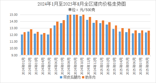 8月份,我区猪肉价格有升有降。其中猪带皮后腿肉价格8月份各旬环比涨幅分别为0.73%、-0.88%、0.49%,猪肋条肉价格各旬环比涨幅分别为0.63%、-0.94%、-0.16%。猪带皮后腿肉、猪肋条肉8月全区平均零售价格分别为每500克12.38元、12.63元。环比,猪带皮后腿肉价格略涨0.57%,猪肋条肉价格略降0.32%。同比,猪带皮后腿肉、猪肋条肉价格分别下降17.41%、17.88%。