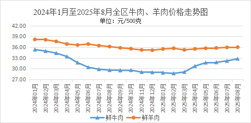 牛肉、去骨羊肉8月全区平均零售价格分别为每500克32.73元、35.98元。环比,牛肉、去骨羊肉价格分别上涨1.80%、0.19%。同比,牛肉价格上涨10.72%,去骨羊肉价格略降0.44%。
