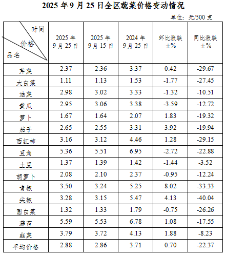 9月25日,全区蔬菜综合平均零售价格为2.88元/500克,环比略涨0.70%。本旬监测的15种蔬菜品种价格8涨7降,上涨幅度占前五位的品种为青椒、尖椒、茄子、韭菜、萝卜,分别上涨8.02%、4.13%、3.92%、1.88%、1.83%。与去年同期相比,15个蔬菜品种综合平均零售价格下降22.37%。