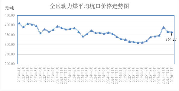 1月份,全区动力煤月度平均坑口价格为364.27元/吨,与2025年12月份相比(下称环比)下降0.55%,与2025年1月份相比(下称同比)上涨5.89%。其中,东部褐煤平均坑口价格为333.86元/吨,环比价格略涨0.73%,同比价格上涨1.61%;鄂尔多斯地区动力煤平均坑口价格为417.50元/吨,环比价格下降2.28%,同比价格上涨12.53%。