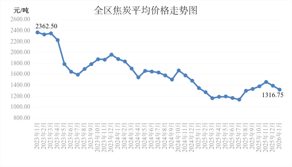 2025年12月,全区焦炭月度平均价格为1316.75元/吨,环比价格下降5.19%,同比价格下降2.13%。