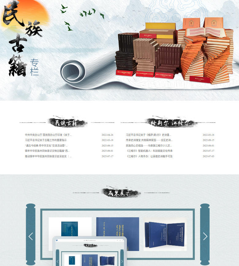 精雕细琢出典籍,打造出版精品力作。在扎实整理研究的基础上,致力于民族古籍出版工作,推动文化成果惠及各族群众。传统出版方面,推出了《中国少数民族古籍总目提要·蒙古族卷》、《蒙古文献丛书》、《内蒙古地方文献丛书》、《格斯尔》丛书、《江格尔》研究前沿丛书等300余种珍贵古籍文献,构建起了多系列、多层次的民族古籍出版体系。原始档案文书整理出版方面,牵头编纂出版了《鄂尔多斯右翼中旗蒙古文历史档案选编》(12 卷)、《杭锦旗札萨克衙门档案》(90卷)、《阿拉善和硕特旗蒙古文历史档案》(80卷)、《清代蒙古诸部满文档案译丛》(6卷)、《黑龙江将军衙门达斡尔族满文档案选编》(20卷),与锡林郭勒盟苏尼特左旗合作出版了《苏尼特左旗历史档案汇编》(2 卷)等档案文书210余卷。铸牢中华民族共同体意识古籍整理出版书系方面,现已完成“国家民委铸牢中华民族共同体意识古籍整理出版书系”第一、二批立项成果《托忒文〈西游记〉》、《哈斯宝蒙古文版〈新译红楼梦〉》整理出版任务;新立项课题清末毛笔手抄本《水浒传》蒙古文译本、嘉靖本《三国志通俗演义》,计划于年底整理出版。