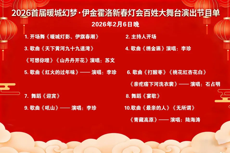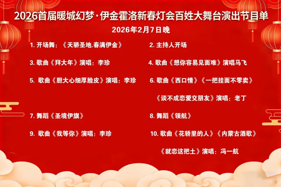 灯火映新春 欢歌庆佳节2026首届暖城幻梦·伊金霍洛新春灯会百姓大舞台2月6日(周五)启幕两场陕北民俗视听盛宴接连登场邀你共赴新春之约解锁最浓年味儿春晚歌手×星光大道×全网爆款×非遗传承四大王牌同台飙戏本次百姓大舞台聚焦陕北民歌特色,汇聚多位实力歌手与非遗传承人,用高亢婉转的唱腔、灵动洒脱的舞姿,演绎黄土高原的文化底蕴与新春的喜庆祥和,既有经典民歌的原汁原味,也有非遗艺术的创新表达,承包你周末的欢乐时光。活动同步开启线下直播,无法到场的朋友可锁定视频号,云端共赏精彩。演出时间第一场▼2月6日(周五)19:40-20:20第二场▼2月7日(周六)19:40-20:20演出地点伊金霍洛旗生态公园(原母亲公园)东门(东南角)演出节目单两场演出星光熠熠,陕北民歌大咖齐聚,各展风采,更有《暖城灯影、伊旗春潮》《天骄圣地·春满伊金》等特色开场舞,以及《迎宾》《领航》等精彩舞蹈表演。歌舞相融,氛围感拉满,带你沉浸式感受新春的热闹与陕北文化的厚重魅力。直播通道本次两场演出均开启线下直播,扫描下方视频号二维码,即可锁定精彩。