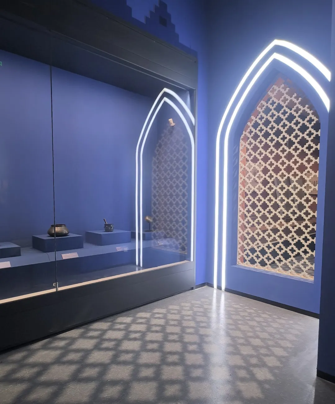 蓝色展厅+发光拱门+几何纹样墙面,拍全身照秒变波斯宫廷风写真,纵深感拉满,仿佛穿越到了千年之前的波斯宫殿。