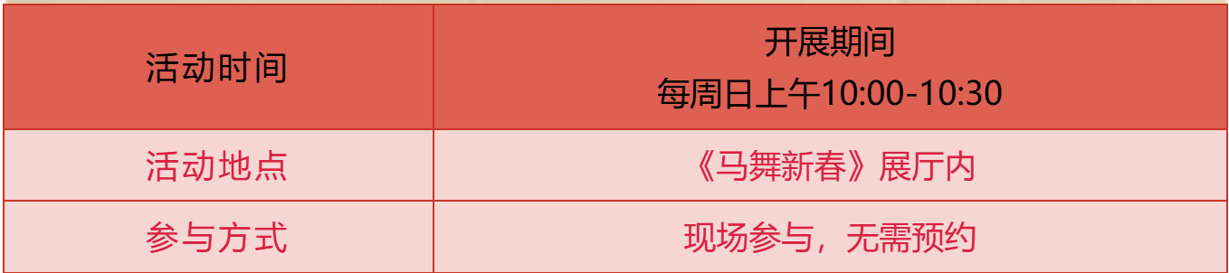 丙午马年踏春来!开展期间每周日上午10:00-10:30,专业讲解员带你“穿越”展厅,深挖文物背后的传奇故事,解析马文化的千年传承,让每一次观展都满载知识与感动,更有深度、更有温度!