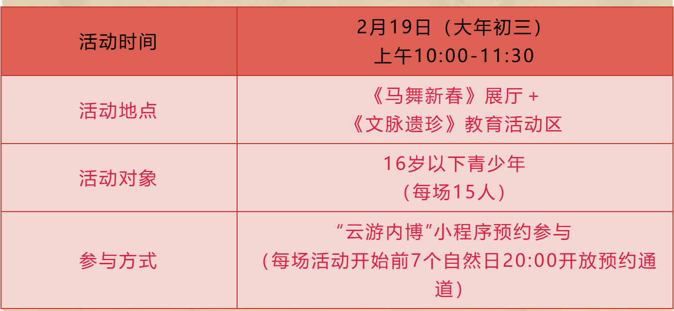 新春将至,年味渐浓!内蒙古博物院重磅推出“马舞新春——丙午马年全球生肖文化联展”,2月5日-4月5日,一场跨越古今的马文化盛宴即将启幕!打破静态观展局限,我们带来“可感、可触、可创、可思”的七大主题活动,让马文化从展柜中走出,融入你的视听触感与创意瞬间,邀你共赴一场“见展、见物、见技艺、见精神”的文化之约~