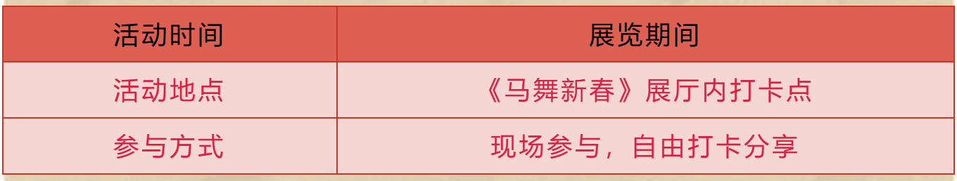 展厅特设主题打卡点,邀你定格与马文化的精彩瞬间!拍照分享至社交媒体,不仅能成为展览的一部分,还能为这场文化盛宴助力二次传播,让更多人感受传统文化的魅力。