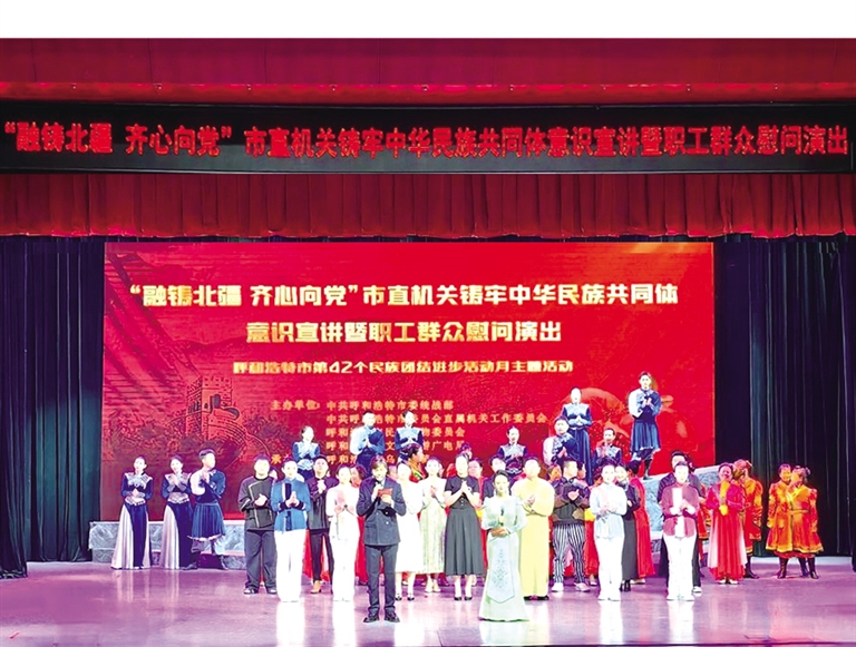 呼和浩特市举办“融铸北疆 齐心向党”市直机关铸牢中华民族共同体意识宣讲暨职工群众慰问演出活动。