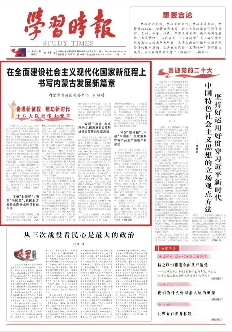9月21日,由中共中央党校(国家行政学院)主管主办的《学习时报》在头版头条刊发内蒙古自治区党委书记孙绍骋署名文章《在全面建设社会主义现代化国家新征程上书写内蒙古发展新篇章》。