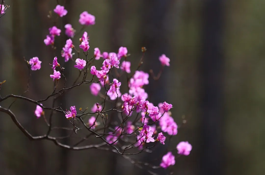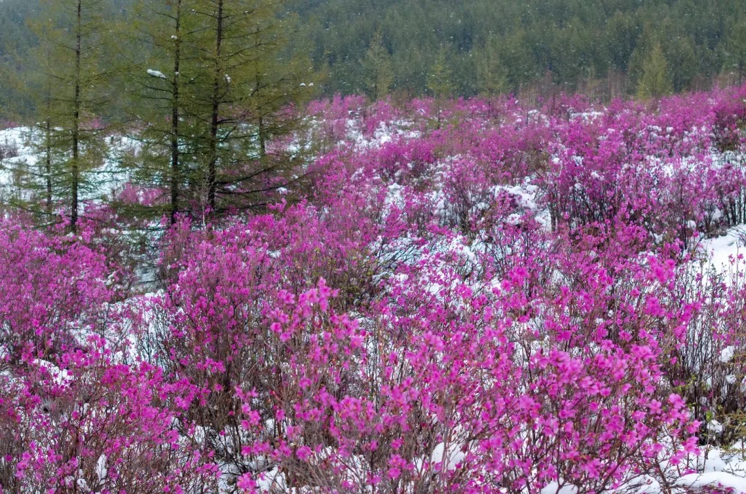 兴安杜鹃扎根万年前的火山熔岩,在零下 40℃的寒冬孕育,5月顶着冰雪盛放。