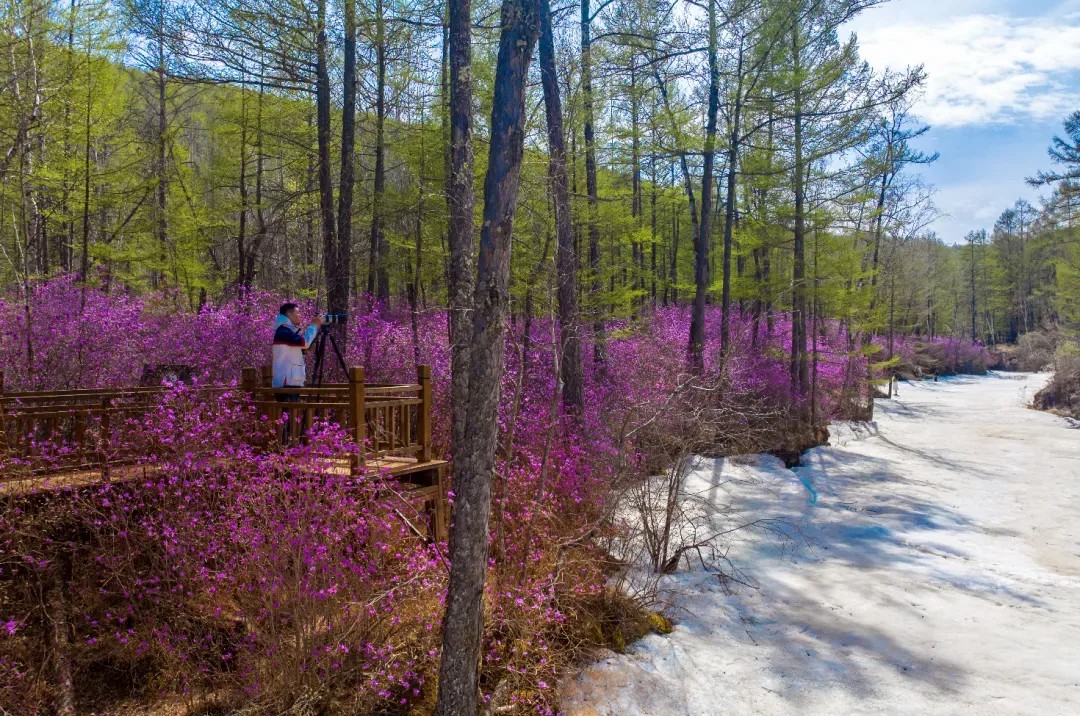 5月,残雪未消,上万朵杜鹃同时绽放,粉紫花潮与蓝冰碰撞,美如梦幻。冰雪未消,花海灿烂,尽显独特魅力。