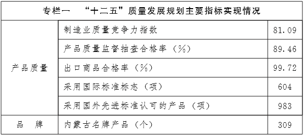 ———产品质量稳步提高。与“十一五”末期相比,“十二五”末期我区制造业质量竞争力指数从77.29提升到81.09,与发达省市差距从9.49缩小至7.97,与全国平均指数差距从2.69缩小至1.05;产品质量监督抽查合格率从81.86%提高到89.46%; 主要农产品质量安全监测合格率达到95%,出口商品质量稳步提升;2015年末,全区采用国外先进标准认可的产品983项, 采用国际标准标志604项;309个产品被授予“内蒙古名牌产品”称号;从2011年至2015年,共有20家企业获得自治区政府主席质量奖。