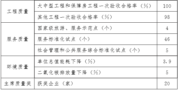 (2)工程质量。新开工建设工程质量水平稳步提升,节能、环保、安全、信息技术含量显著增强,装备式建筑占比达到30%,建筑工程节能效率不断提高,绿色建筑和智能建筑得到推广应用,抗各类灾害能力明显提高,无重大工程质量事故发生, 大中型工程项目一次验收合格率保持100%,其他工程一次验收合格率保持98%以上,交通建设工程交工和竣工验收合格率均达到100%,人民群众对工程质量满意度显著提高。