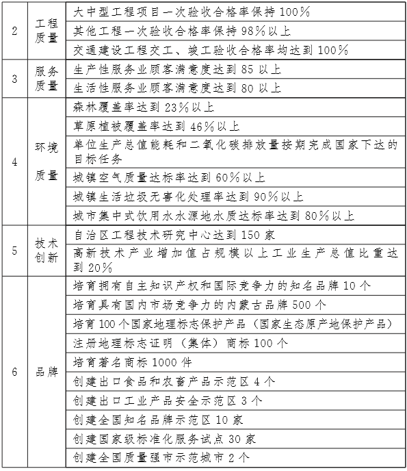 建立符合我区产业特点的品牌价值评价体系,培育形成10个具有自主知识产权和国际竞争力的知名品牌,500个以上具有国内市场竞争力的内蒙古品牌,100个国家地理标志保护产品(国家生态原产地保护产品),注册地理标志证明(集体)商标100个,1000件著名商标,4个出口食品和农畜产品示范区,3个出口工业产品质量安全示范区,10家全国知名品牌创建示范区,30家国家级标准化服务试点,创建2个全国质量强市示范城市。