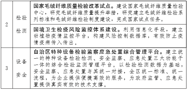 加大高精尖的基础性、关键性检测设施投入和检测技术自主研发力度,开展关键、共性检测技术攻关,研发一批高水平的检验检测方法、技术标准,提升检验检测技术机构的核心竞争力。 推进跨地区、跨部门检验检测机构优化整合,促进不同层级、不同功能、不同所有制检验检测机构各具特色、错位发展。突出国家级、自治区级质检中心建设,提高盟市级检验检测机构综合性检验检测能力,形成布局合理、实力雄厚、科学公正的检验检测服务体系。支持检验检测技术机构加强与国内外技术机构的合作,实现检验检测结果国际或地区间互认。加快质量检测公共服务平台建设,面向社会和企业开展质量检测、技术标准、风险预警、研发创新和咨询培训等方面的优质服务。对检验检测技术机构实施分类指导和监管,规范检验检测行为,提高检验检测质量和服务水平。到2020年建成国家级检验检疫重点实验室3家、 国家质检中心10家、自治区质检中心20家、产业计量测试中心2家,重要日用消费品质量安全监管检验检测能力覆盖率达95%以上、矿产资源质量检验检测能力覆盖率达90%以上。