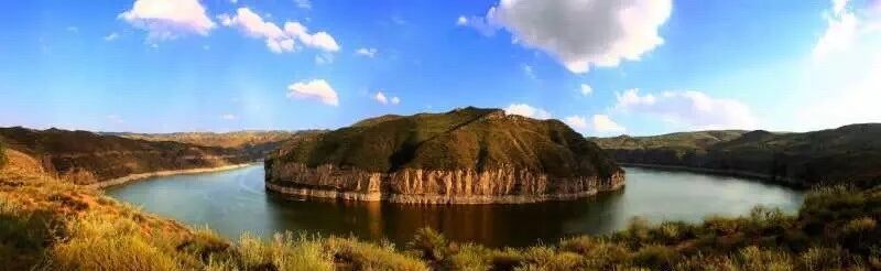 进入峡谷,站在“V”字观景台上,极目远眺,逶迤[wēi yí]的河流紧紧环抱着峡谷,几步一回头,在群山间折出一个完美的“S”形太极湾,远远望去,像一条碧色的玉带在清风中舞动漂浮,又像一条青翠圣洁的哈达,传唱着母亲河对准格尔儿女们的深深祝福。