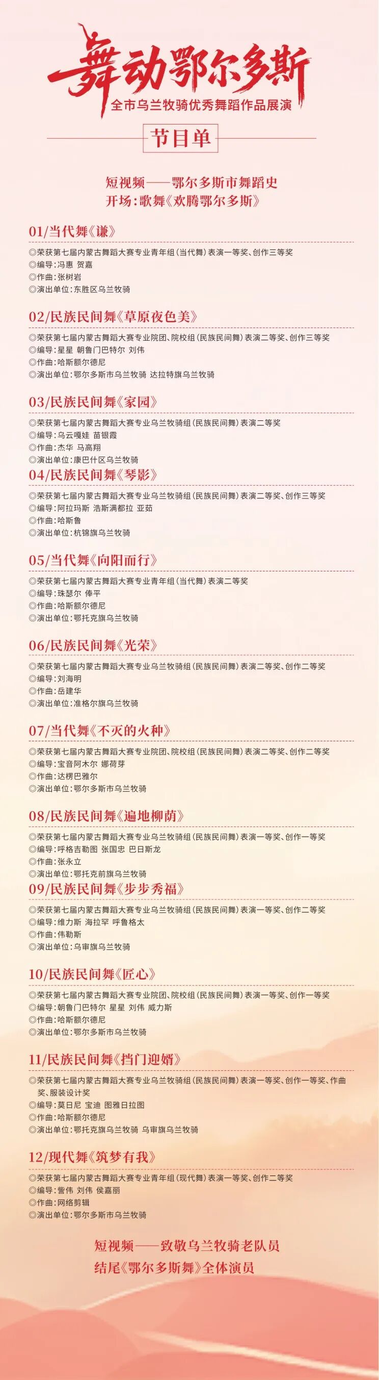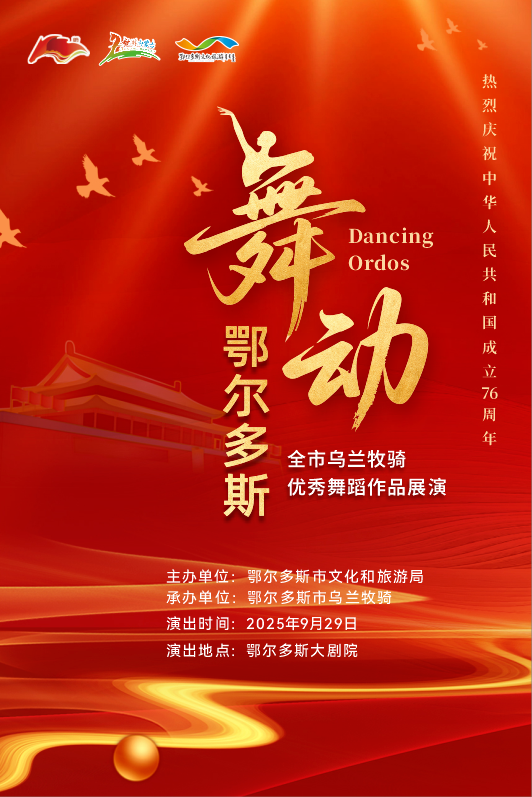 为深入落实北疆文化建设提升行动,丰富群众精神文化生活,营造喜庆祥和的国庆节日氛围,9月29日,由鄂尔多斯市文化和旅游局主办,鄂尔多斯市乌兰牧骑承办的舞蹈晚会“舞动鄂尔多斯”将在鄂尔多斯大剧院隆重上演。晚会以“传承地域文脉、彰显时代精神”为主题,汇聚全市乌兰牧骑在第七届内蒙古舞蹈大赛中的获奖佳作,精心遴选了12部获奖舞蹈作品,涵盖民族民间舞、当代舞、现代舞等多种类型,充分体现鄂尔多斯舞蹈创作的多元与创新,通过艺术的形式展现鄂尔多斯深厚的文化底蕴与时代风采。