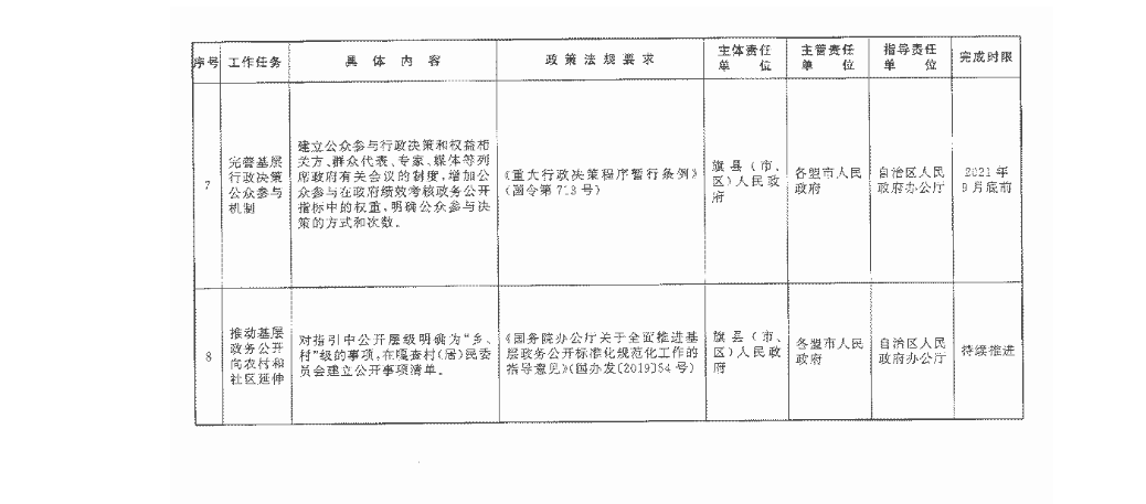 (一)建立基层政务公开工作规范。基层政府要严格落实国家和自治区关于全面推进政务公开工作的要求,认真贯彻执行《政府信息公开条例》,制定完善本地区信息管理、信息发布、解读回应、依申请公开、公众参与、监督考核等方面的制度规范,于2021年3月底前在本地区政府信息公开平台向社会公开。同时,鼓励将政务公开事项标准目录及制度规范嵌入部门业务系统,并适时列入政府绩效考核政务公开指标体系,促进公开工作与其他业务工作融合发展。