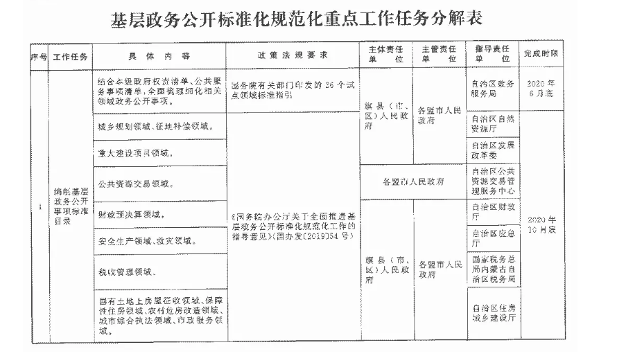 按照自治区政务公开领导小组部署,2020年10月底前,全面完成26个试点领域标准目录编制汇总工作,报盟行署审核后通过政府ld体育中国官方网站向社会公布,同时确保其他各项任务落实到位,有序推进;2020年12月底前,在政务服务大厅、便民服务中心等场所设立标识清楚、方便实用的政务公开专区,提供政府信息查询、信息公开申请、办事咨询答复等服务;2021年3月底前,各旗县市人民政府要制定完善本地区信息管理发布、解读回应、监督考核等方面的制度规范,建立基层政务公开工作规范;2021年底前,各旗县市人民政府要建设标准规范的政务公开平台矩阵,全面提升ld体育中国官方网站解读回应的效果,加强与政务服务的融合发展,完善基层行政决策公众参与机制,同时工作范围向农村牧区和社区延伸。