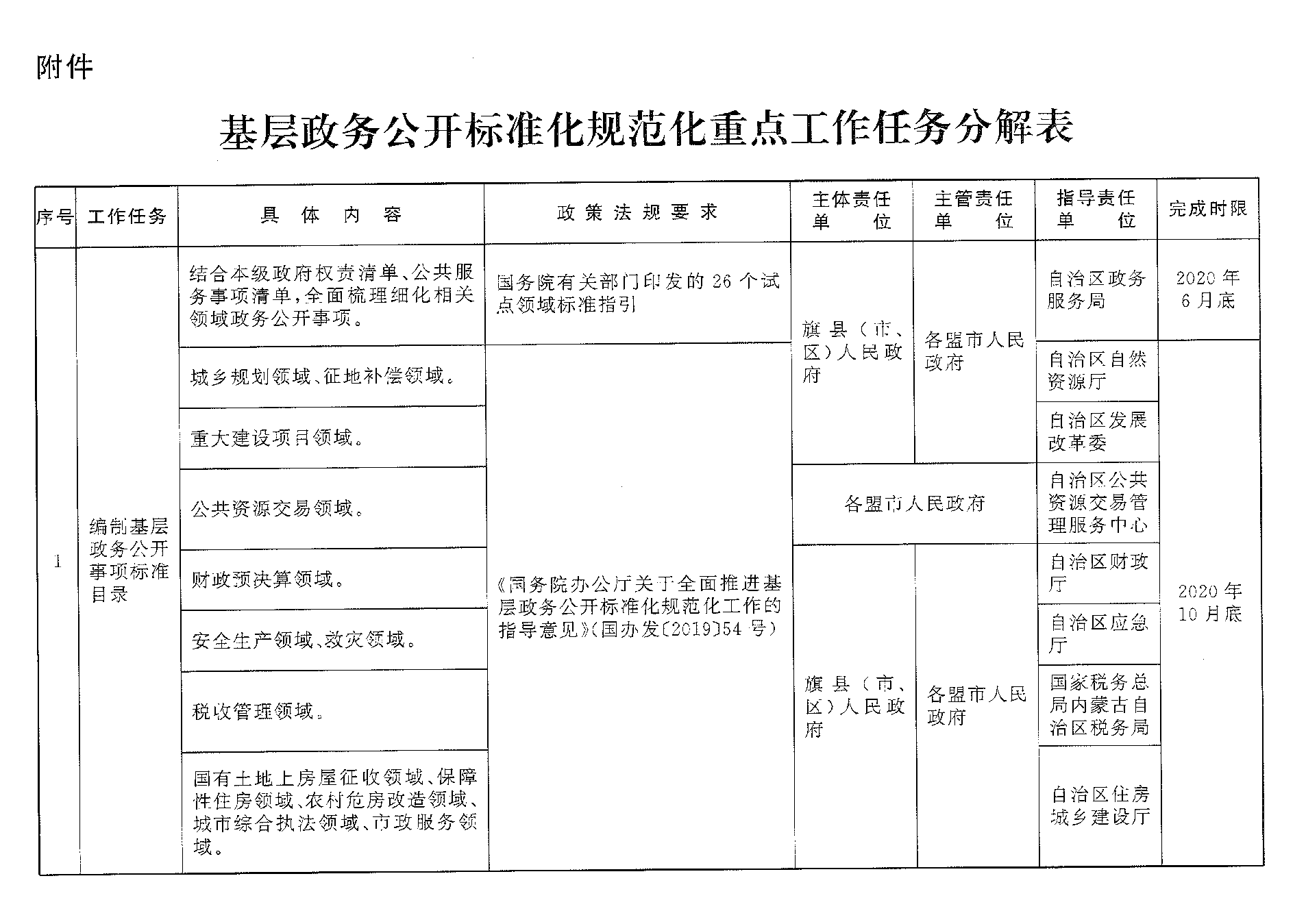 (一)编制基层政务公开事项标准目录。基层政府(包括旗县级人民政府和苏木乡镇人民政府、街道办事处)要对照国务院有关部门印发的26个试点领域标准指引及有关要求,结合本级政府权责清单、公共服务事项清单等,全面梳理细化26个试点领域政务公开事项,除有法律、法规、规章等明确规定不予公开的,其余均应列入公开事项。基层政府应于2020年10月底前编制完成包括公开事项名称、内容、依据、时限、主体、渠道、公开对象和方式等要素的本级政府政务公开事项标准目录,作为本地区开展政务公开工作的基本遵循。