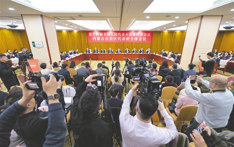 3月6日下午,十四届全国人大四次会议内蒙古代表团在驻地举行全团会议,本次全团会议向参加全国两会报道的境内外媒体开放,蓬勃发展的内蒙古吸引了众多媒体记者前来采访。聚焦全面贯彻习近平总书记对内蒙古系列重要讲话重要指示精神,代表们以铸牢中华民族共同体意识为主线,紧紧围绕落实自治区党委“1571”工作部署,谈感受、谋突破,充分展现了全区上下推动高质量发展、加快闯新路的信心决心,生动讲述了内蒙古勇毅前行、开拓进取的奋进故事。