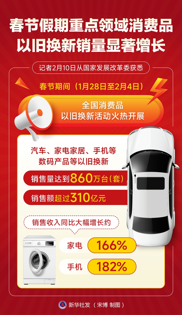 记者2月10日从国家发展改革委获悉,春节期间(1月28日至2月4日),全国消费品以旧换新活动火热开展,汽车、家电家居、手机等数码产品等以旧换新销售量达到860万台(套)、销售额超过310亿元,家电、手机销售收入同比大幅增长约166%、182%,消费市场活力有效提升。