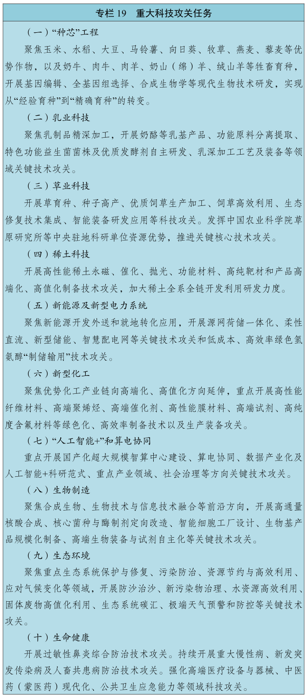 立足维护国家“五大安全”,推动蒙东地区振兴实现新突破,巩固生态优势,做成农牧业大产业,发展现代能源经济,培育特色工业体系,发展泛口岸经济,加快补齐基础设施短板。推出特色四季旅游产品,大力发展冰雪经济。推进高标准农田建设,实施大面积粮食单产提升行动,促进畜牧业增产增效。优化能源资源开发利用方式,提升蒙东煤炭资源接续能力和自给能力,统筹优势矿种开发和全产业链发展。完善“口岸+腹地”联动发展机制,开展进口资源落地加工。