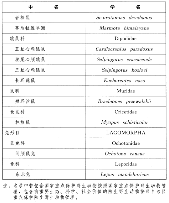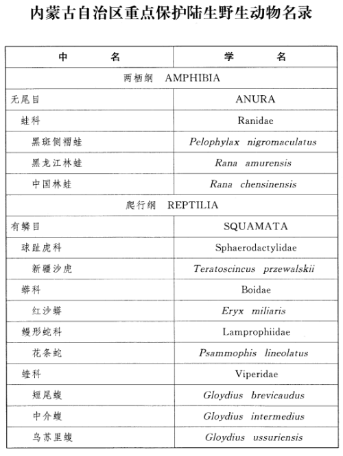 根据《中华人民共和国野生动物保护法》相关规定,为明确我区珍贵、濒危野生动物种类,经自治区人民政府同意,现将《内蒙古自治区重点保护陆生野生动物名录》予以公布,请结合实际,进一步做好野生动物保护和管理工作。