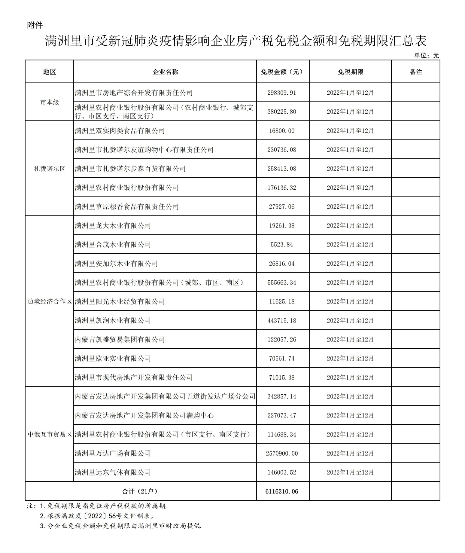 一、同意免征满洲里市房地产综合开发有限责任公司等21户企业2022年1月至12月房产税合计6116310.06元。具体免税企业名称、免税金额及免税期限见附件。