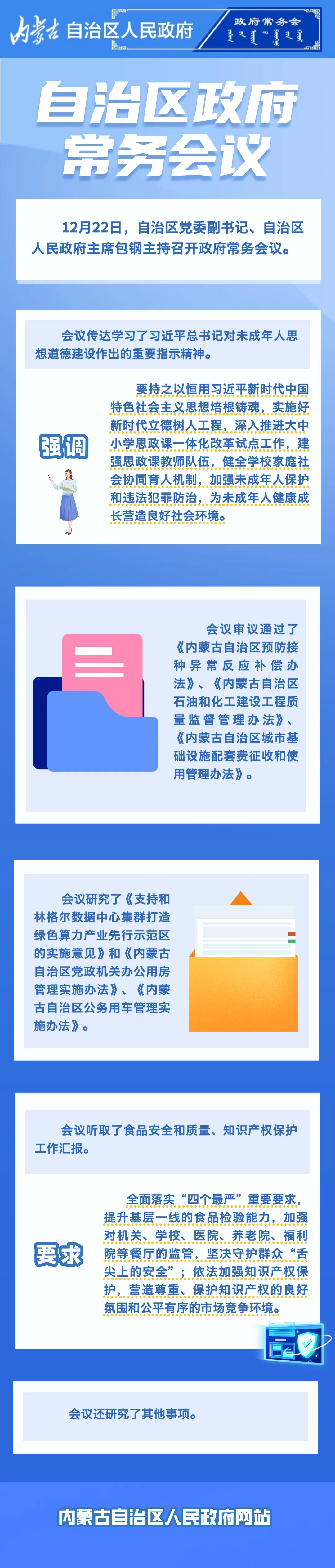 会议研究了《支持和林格尔数据中心集群打造绿色算力产业先行示范区的实施意见》和《内蒙古自治区党政机关办公用房管理实施办法》、《内蒙古自治区公务用车管理实施办法》。