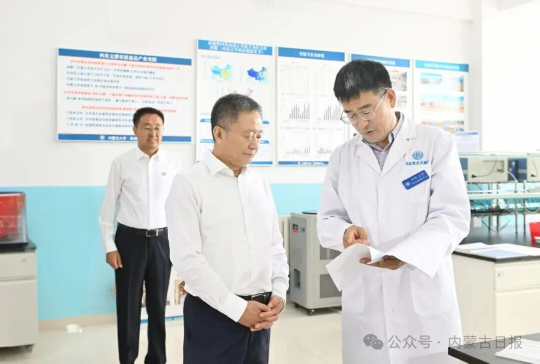 9月8日,自治区党委书记孙绍骋在教育部重点实验室草地健康中心察看羊草培育、盐碱草原治理等科研成果,听取探索草原生态治理低成本路径、科技支撑草原畜品产业突围等情况介绍。草原云·内蒙古新闻网记者马建兵 摄