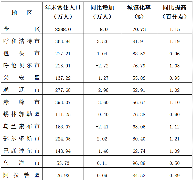 全区常住人口中,城镇人口1689万人,比2023年增加21.9万人;乡村人口699万人,比2023年减少29.9万人。常住人口城镇化率70.73%,比2023年提高了1.15个百分点。