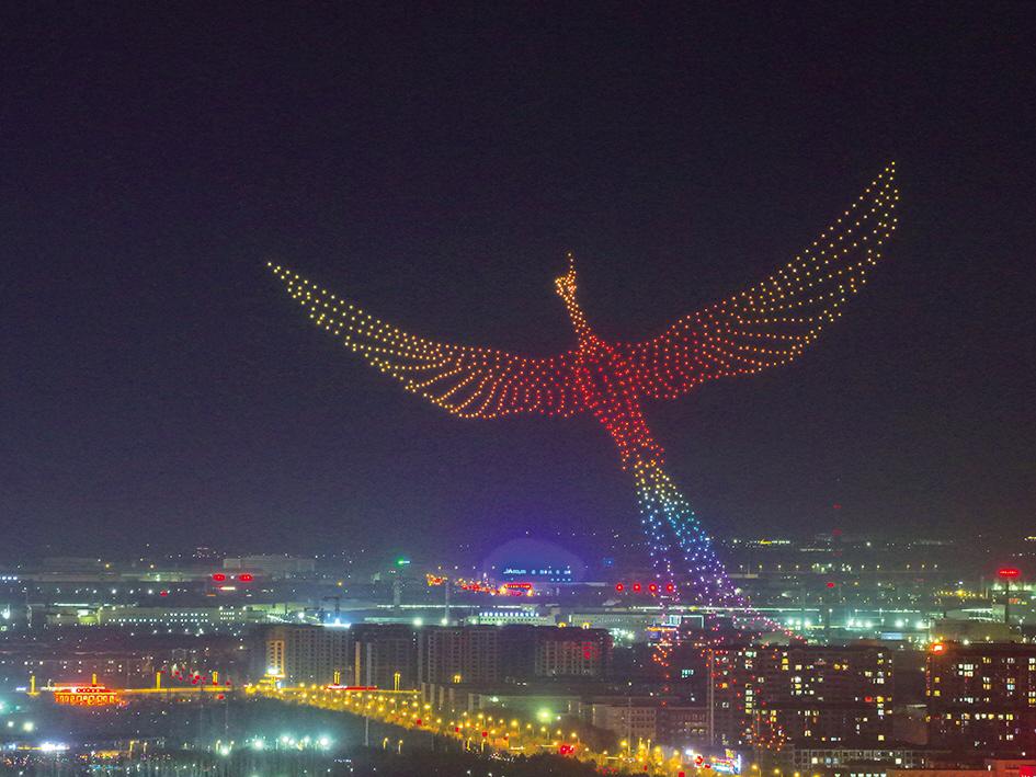 无人机组成的凤凰与城市夜景交融 记者 李鸿瑶 摄