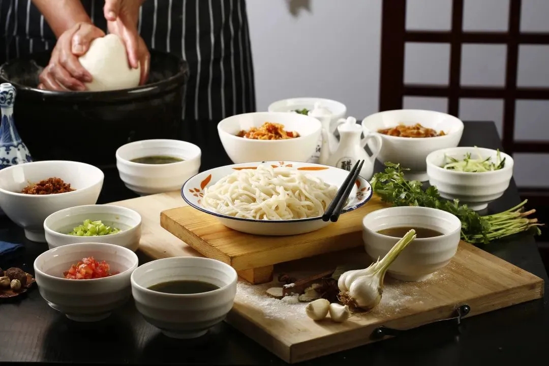 将雪花粉倒入案板中间开窝,加入精盐1钱,然后用冷水和成面团。再将面团1小时揉3次,揉至光滑,下成5钱的小剂,搓成9寸长的小条,放人不锈钢的长盘中,抹上油,饧好待用。过1小时后即可拉成粗细均匀的面条,下入开水锅内煮熟即成。用农家瘦猪肉加土豆、香菇熬成面臊子,浇入拉面中,效果最佳。特点:面条粗细均匀,雪花粉光滑有筋度,再浇上河套农家猪肉臊子,风味独特。