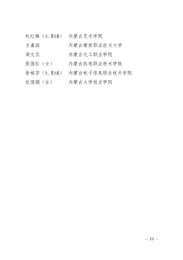 杭红梅(女,蒙古族) 内蒙古艺术学院 方嘉淇 内蒙古建筑职业技术大学 周文杰 内蒙古化工职业学院 张丽红(女) 内蒙古机电职业技术学院 徐桂芳(女,蒙古族) 内蒙古电子信息职业技术学院 杜丽娟(女) 内蒙古大学创业学院 - 19 -