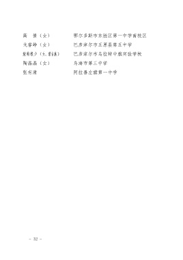 高 倩(女) 鄂尔多斯市东胜区第一中学南校区 戈睿峥(女) 巴彦淖尔市五原县第五中学 敖特根少(女,蒙古族) 巴彦淖尔市乌拉特中旗实验学校 陶晶晶(女) 乌海市第三中学 张有清 阿拉善左旗第一中学 - 32 -