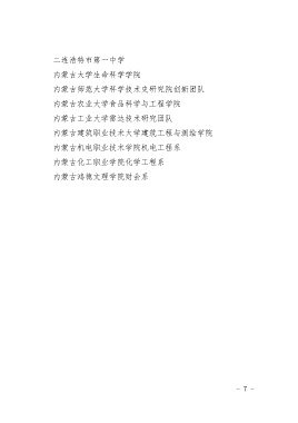 二连浩特市第一中学 内蒙古大学生命科学学院 内蒙古师范大学科学技术史研究院创新团队 内蒙古农业大学食品科学与工程学院 内蒙古工业大学雷达技术研究团队 内蒙古建筑职业技术大学建筑工程与测绘学院 内蒙古机电职业技术学院机电工程系 内蒙古化工职业学院化学工程系 内蒙古鸿德文理学院财会系 - 7 -